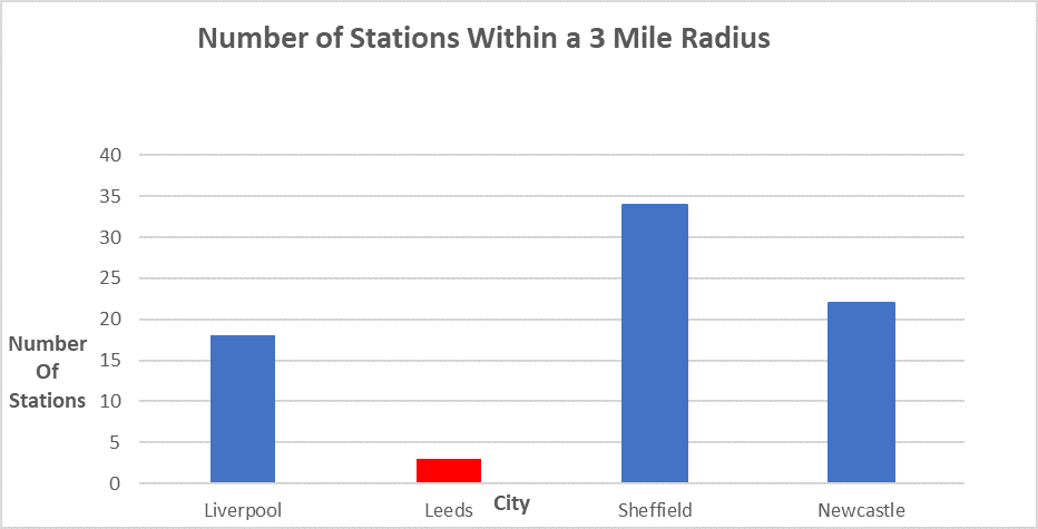 The number of other rapid transport stations (this includes train, metro or tram stations) within a 3-mile radius of the main city station were then counted. This process was then repeated for a range of core northern cities including Liverpool, Sheffield and Newcastle. For Leeds there are just 3 other stations within the 3-mile radius…. Just to clarify that’s not a typo. Compare this with Sheffield, where there are numerous tram stations within a 3-mile radius of the main station. Leeds comes out just as badly when compared against Newcastle and Liverpool, which have numerous metro stations within the same 3-mile radius.