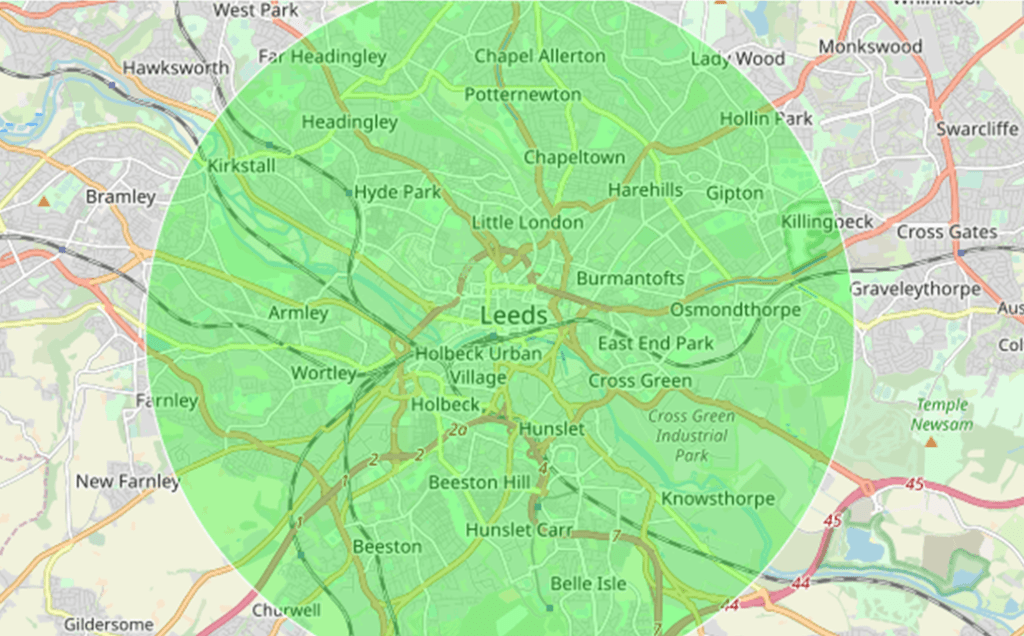 To demonstrate how bad Leeds public transport really is, the following process was implemented. A radius of 3 miles from Leeds station has been drawn, (as is shown below).